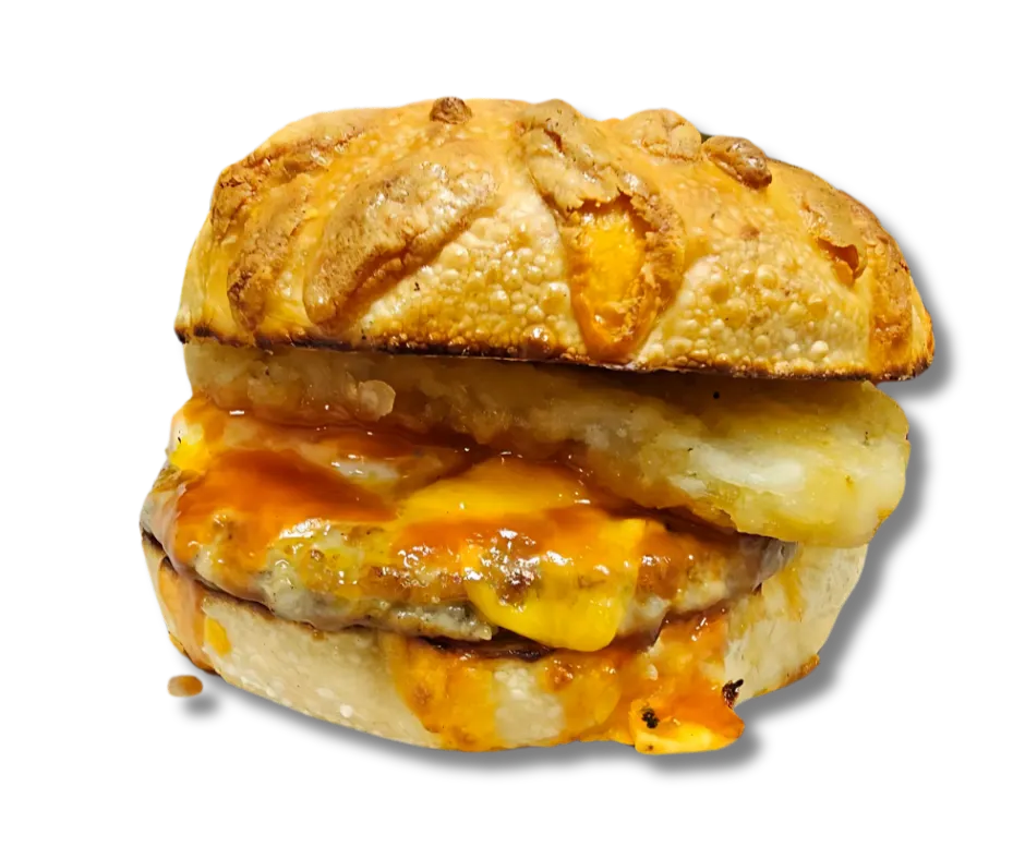 Hashbrowns, sausage, eggs, cheddar cheese, and honey hot sauce blend, on a cheddar bagel