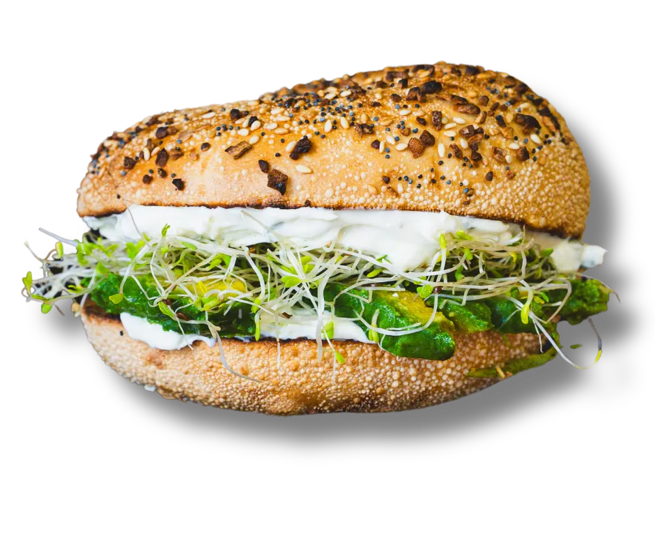 Avocado slices with onion & chive cream cheese, fresh sprouts, on an everything bagel