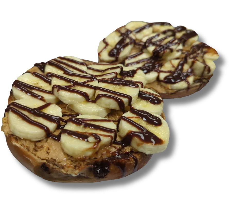 Banana Slices, Honey Peanut Butter, Chocolate Drizzle, on a Chocolate Chunk Bagel