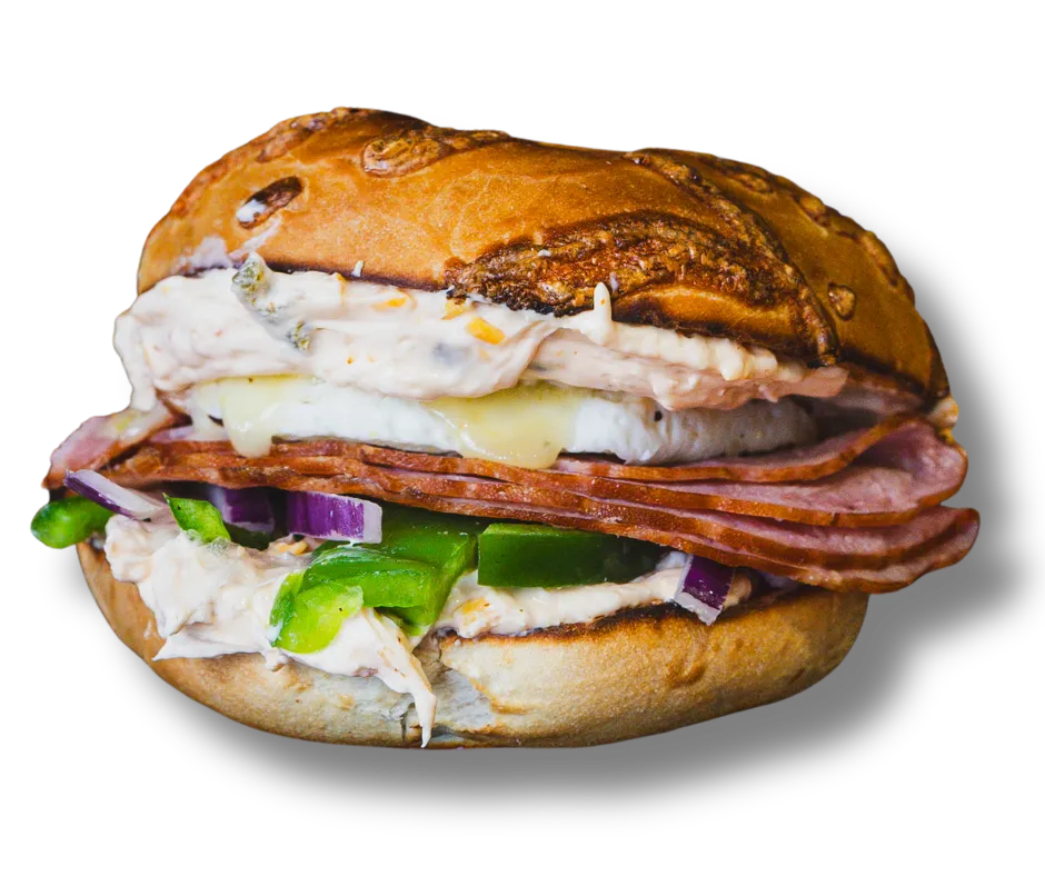 Ham, Egg, Cheddar Pepper Cream Cheese, Pepper Jack Cheese, Green Pepper, Onion, on a Cheddar Bagel