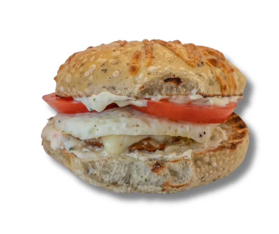 Sausage, Egg, Veggie Cream Cheese, Provolone Cheese, and Tomatoes, on an Italian Parmesan Bagel