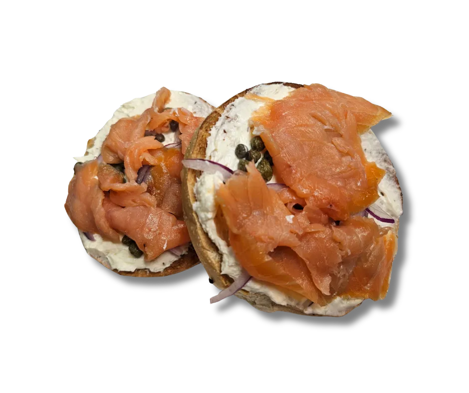 Wild caught Atlantic smoked salmon, plain cream cheese, capers, red onions, on an everything bagel