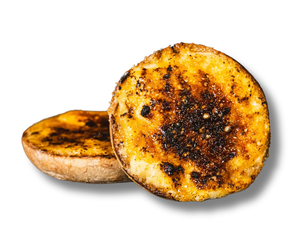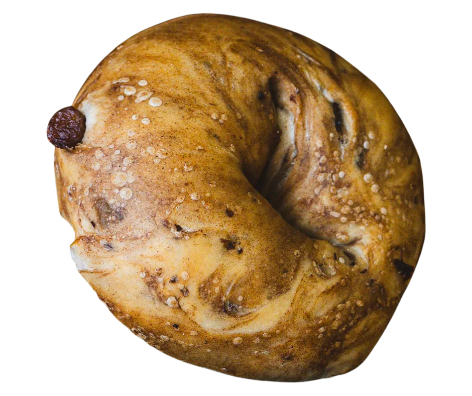Cinnamon swirl bagel topped with vanilla frosting cream cheese, turbinado sugar, torched to perfection, on a cinnamon swirl bagel