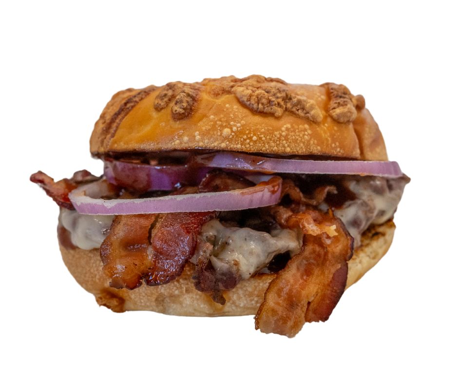 Bacon, BBQ roast beef, Black Cherry Chipotle BBQ, Swiss cheese, and onions on a cheddar bagel.