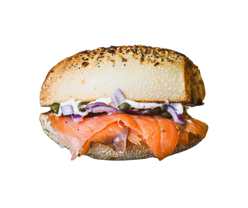 Wild caught Atlantic smoked salmon, plain cream cheese, capers & red onion on an everything bagel