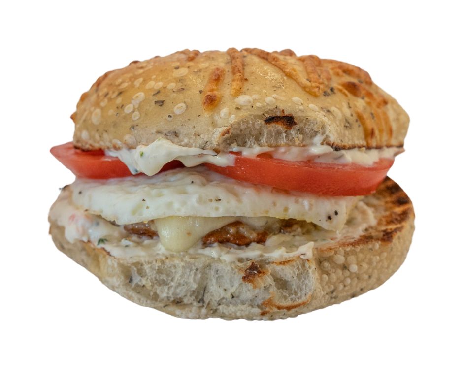 Sausage, Egg, Veggie Cream Cheese, provolone cheese, and tomatoes on a veggie bagel
